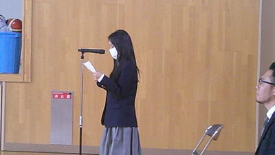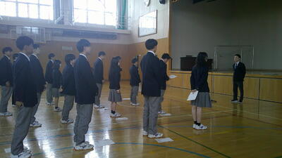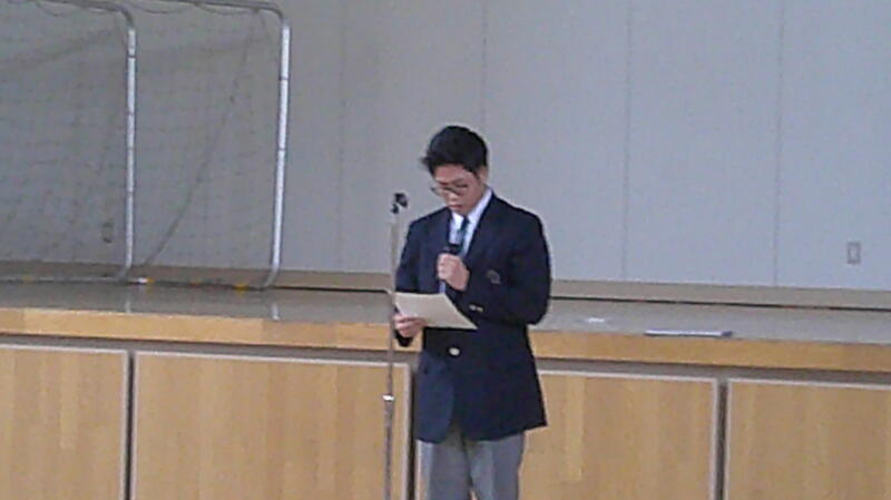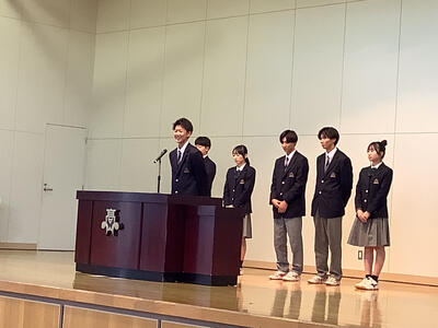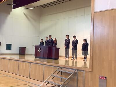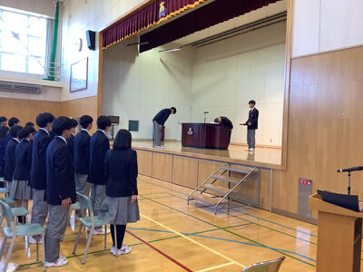 退任式では、田中生徒会長をはじめ今回退任する6名の執行部一人ひとりが全校生徒に向けて感謝の気持ちを込めて退任の挨拶をしてくれました。続けて、第77期の生徒会執行部全員から決意表明を全校生徒に向けてしてもらいました。HR役員も後期に入り新たな顔ぶれとなりましたが、3年生はこれから進路実現に向かって一直線の時期になるので、1・2年生が中心になって学校をつくっていくことになります。