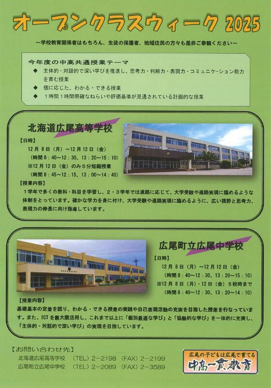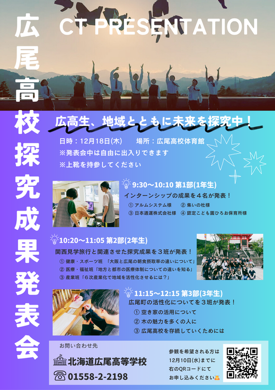 1年生4名はインターンシップでの様子を、2年生3班は関西見学旅行に関連した探究学習を、3年生3班は広尾町の活性化についての探究学習の成果を発表します。