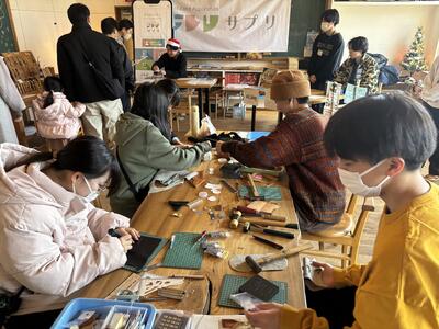 1班は、「広尾町の間伐材を使って製作したボールペンやシャープペンの販売」、もう1班は、「鹿革を使った小物作りのワークショップ」を実施しました。