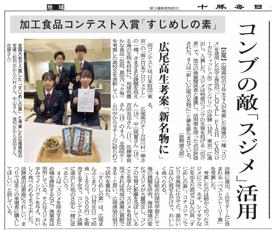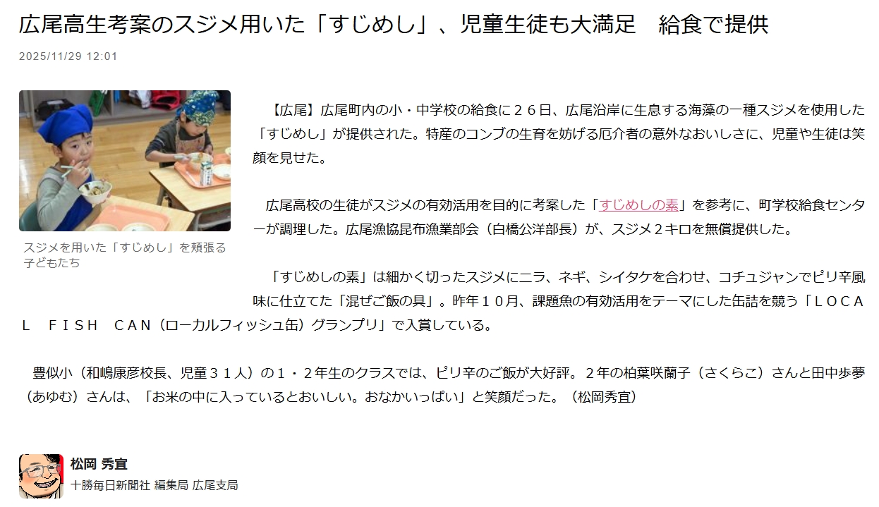 十勝毎日新聞11月29日 広尾高生考案のスジメを用いた「すじめし」、児童生徒も大満足 給食で提供 11.29.jpeg