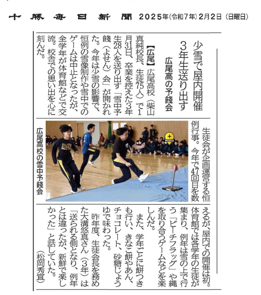十勝毎日新聞2月2日 少雪で屋内開催3年生送り出す 広尾高の予餞会.jpg