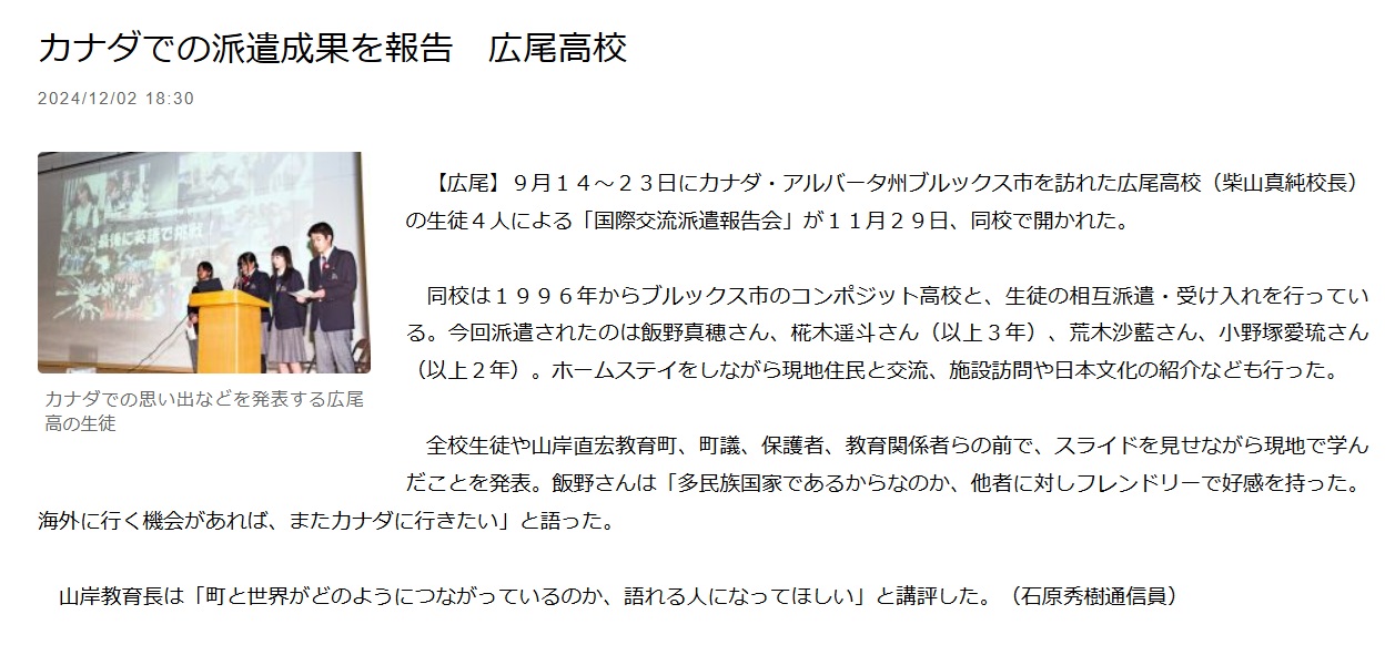 十勝毎日新聞12月3日 カナダでの派遣成果を報告 広尾高校.jpg