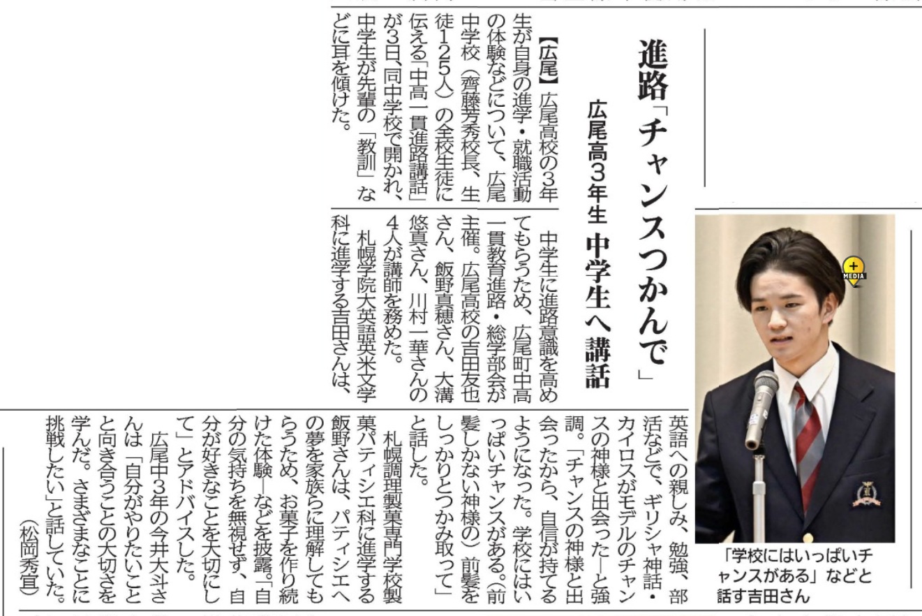 十勝毎日新聞2月7日 進路「チャンスつかんで」広尾高3年生中学生へ講話.jpg