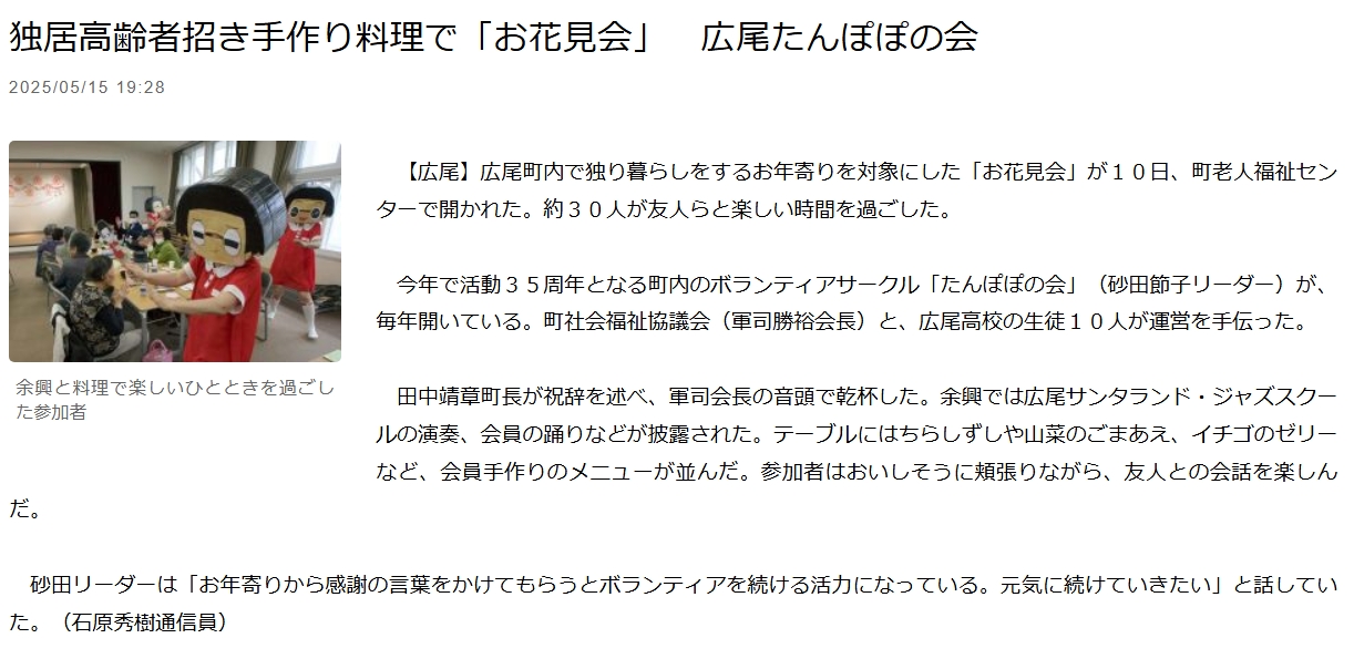 十勝毎日新聞5月15日 独居高齢者招き手料理で「お花見会」 広尾たんぽぽの会.jpeg 5.15(2).jpeg
