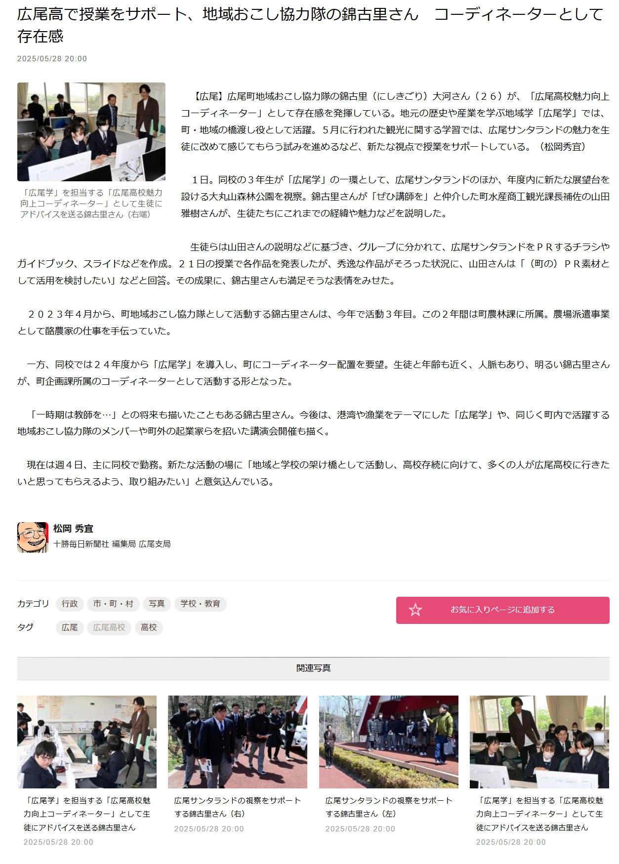 十勝毎日新聞5月28日 広尾高で授業をサポート 地域おこし協力隊錦古里さん コーディネーターとして存在感.jpeg