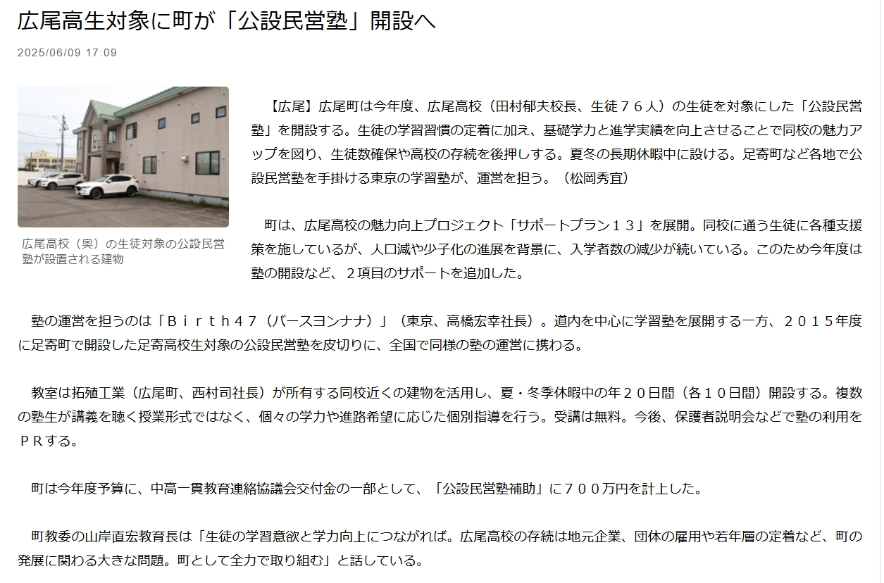 十勝毎日新聞6月 9日 広尾高校生を対象に町が「公設民営塾」開設へ.jpeg