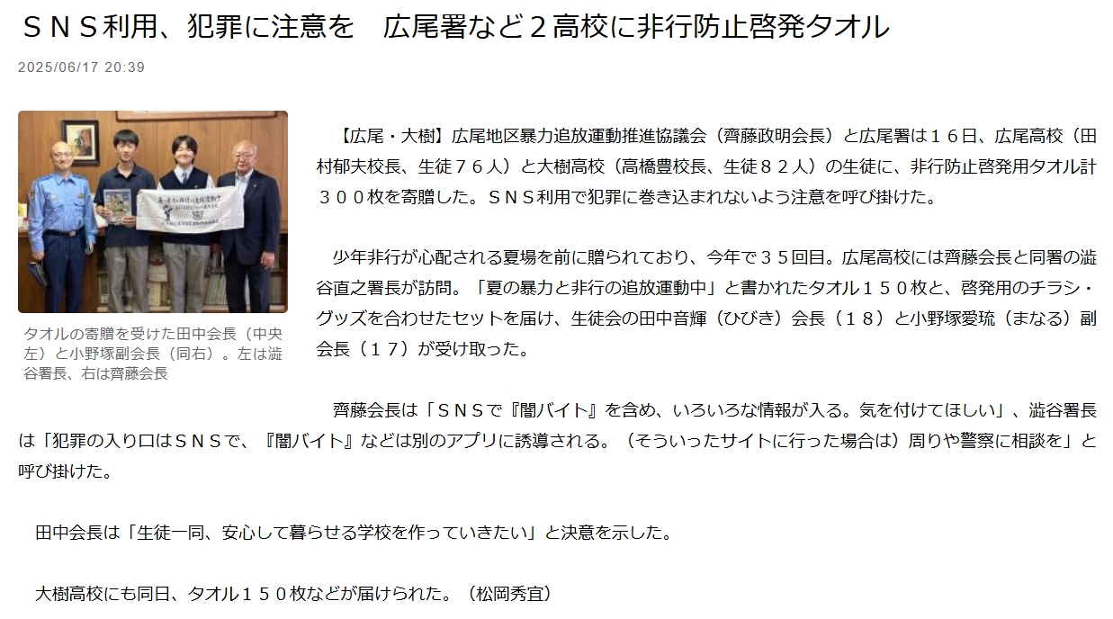 十勝毎日新聞6月17日 SNS利用、犯罪に注意を 広尾高など2高校に非行防止啓発タオル.jpeg