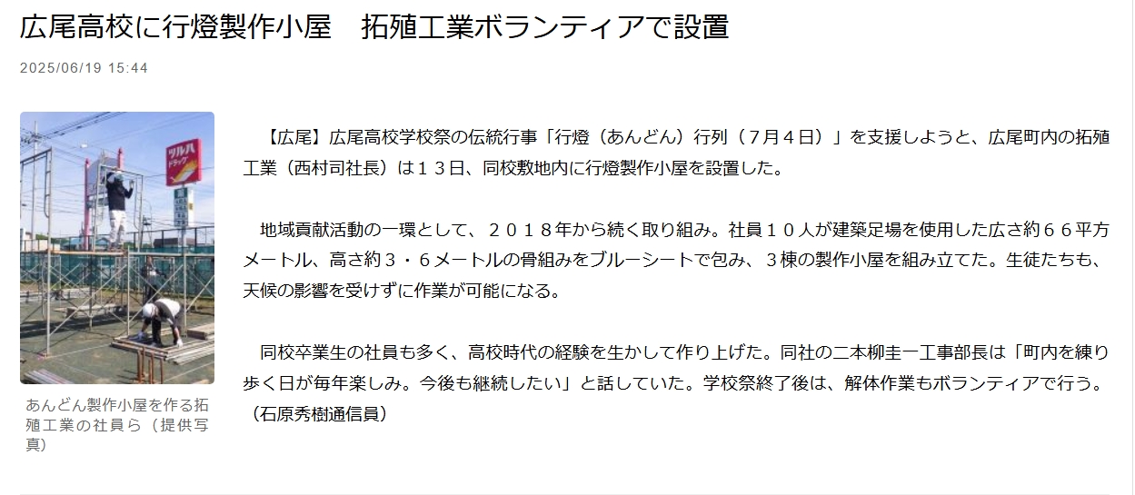 十勝毎日新聞6月19日 広尾高校に行燈制作小屋 拓殖工業がボランティアで設置.jpeg 6.19(2).jpeg