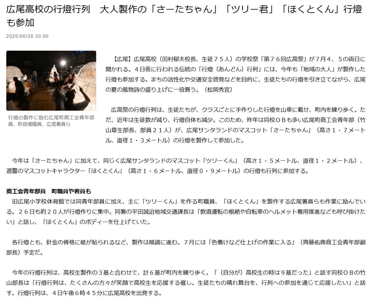 十勝毎日新聞6月29日 広尾高校の行灯行列 大人製作の「さーたちゃん」「ツリーくん」「ほくとくん」行灯も参加.jpeg