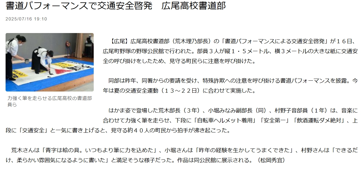 十勝毎日新聞7月16日 書道パフォーマンスで交通安全啓発 広尾高校書道部.jpeg