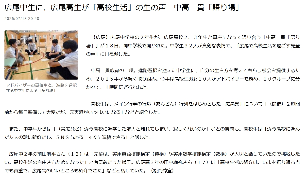 十勝毎日新聞7月18日 広尾中生に、広尾高生が「高校生活」生の声 中高一貫「語り場」.jpeg
