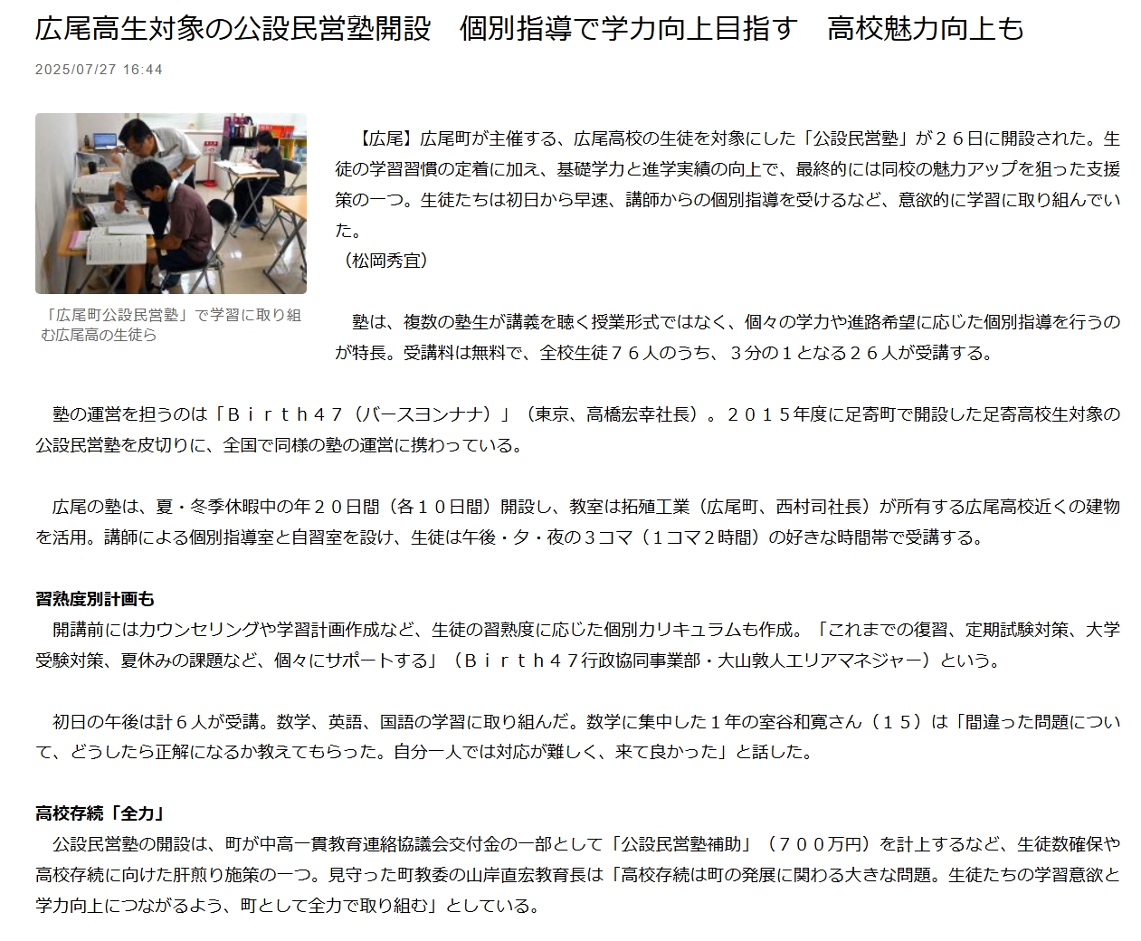 十勝毎日新聞7月27日 広尾高生対象の公設民営塾開設 個別指導で学力向上目指す 高校魅力向上も.jpeg