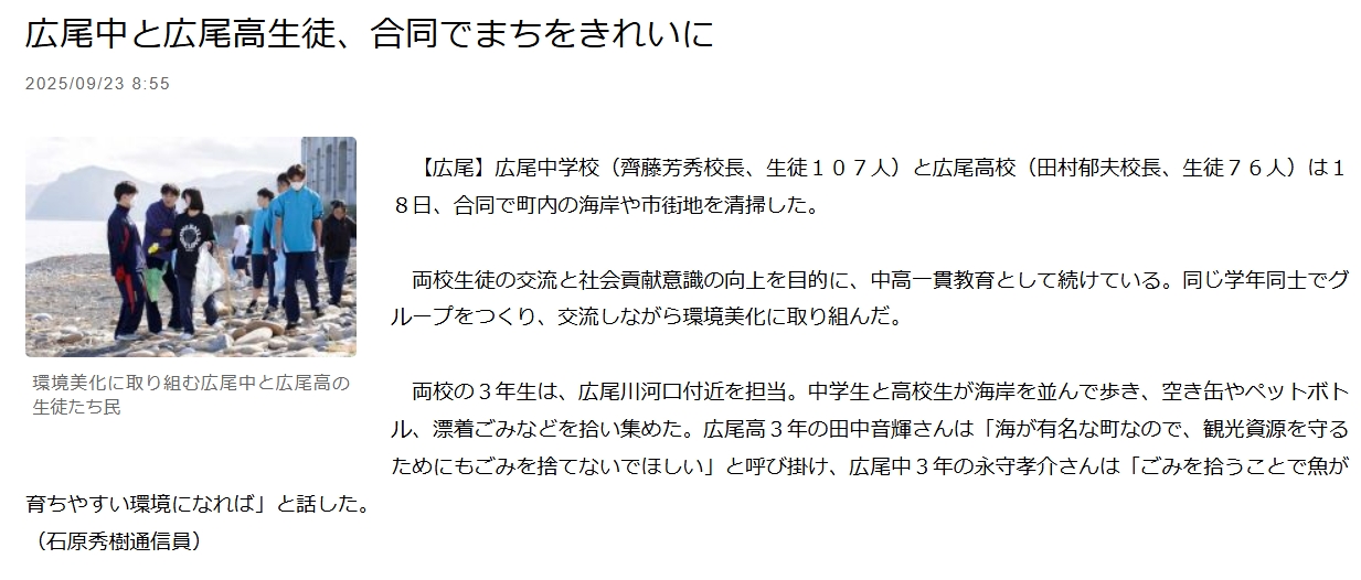 十勝毎日新聞9月23日 広尾中と広尾高生徒 合同でまちをきれいに 9.23.jpeg