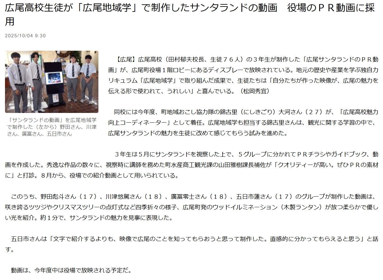 十勝毎日新聞10月 4日 広尾高の生徒が「広尾地域学」で製作したサンタランドの動画 役場のPR動画に採用 10.4.jpeg