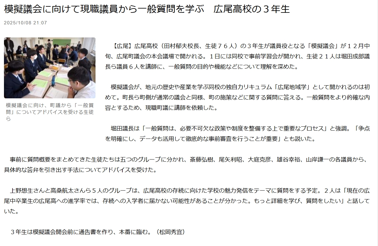 十勝毎日新聞10月 8日 模擬議会に向けて現職議員から一般質問を学ぶ 広尾高校の3年生 10.8.jpeg