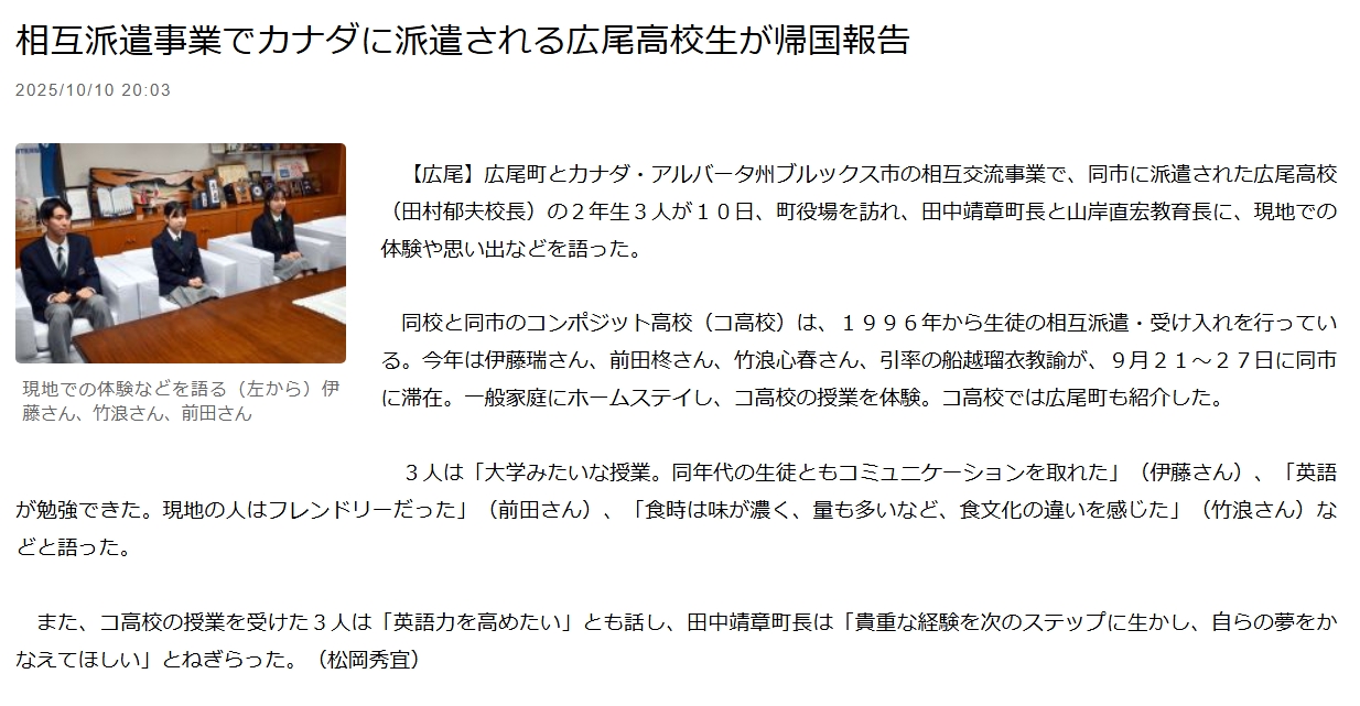 十勝毎日新聞10月10日 相互派遣事業でカナダに派遣される広尾高生が帰国報告 10.10.jpeg