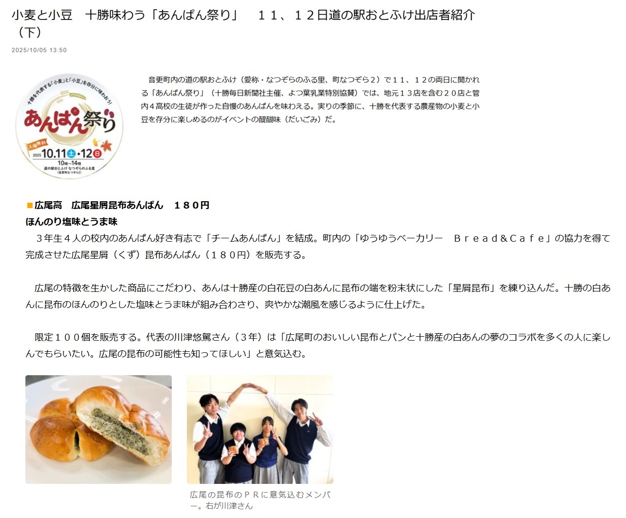 十勝毎日新聞10月 6日 小麦と小豆 十勝味わう「あんぱん祭り」 11、12日道の駅おとふけ出店者紹介 10.6.jpg