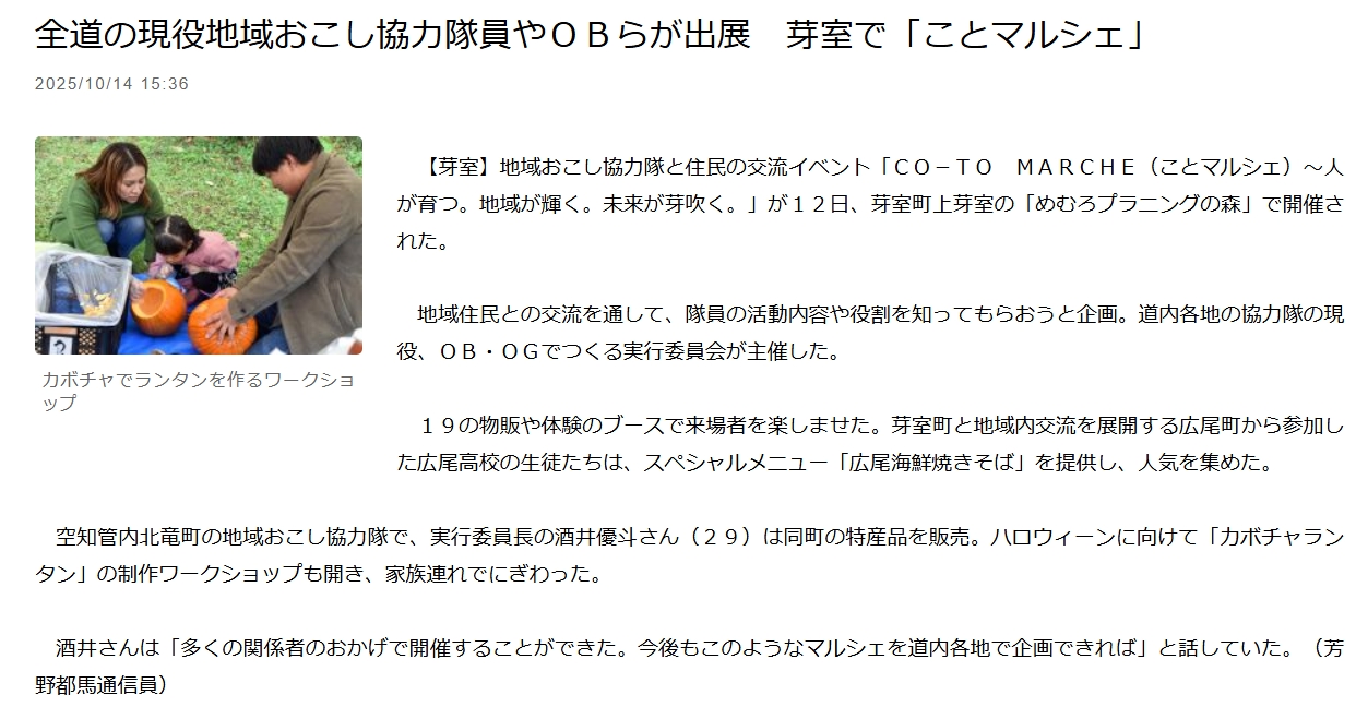 十勝毎日新聞10月14日 全道の現役地域おこし協力隊やOBらが出展 芽室で「ことマルシェ」 10.14.jpeg