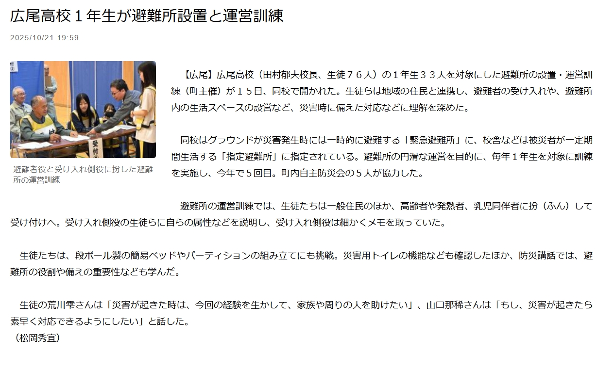 十勝毎日新聞10月21日 広尾高校1年生が避難所設置と運営訓練 10.21.jpeg