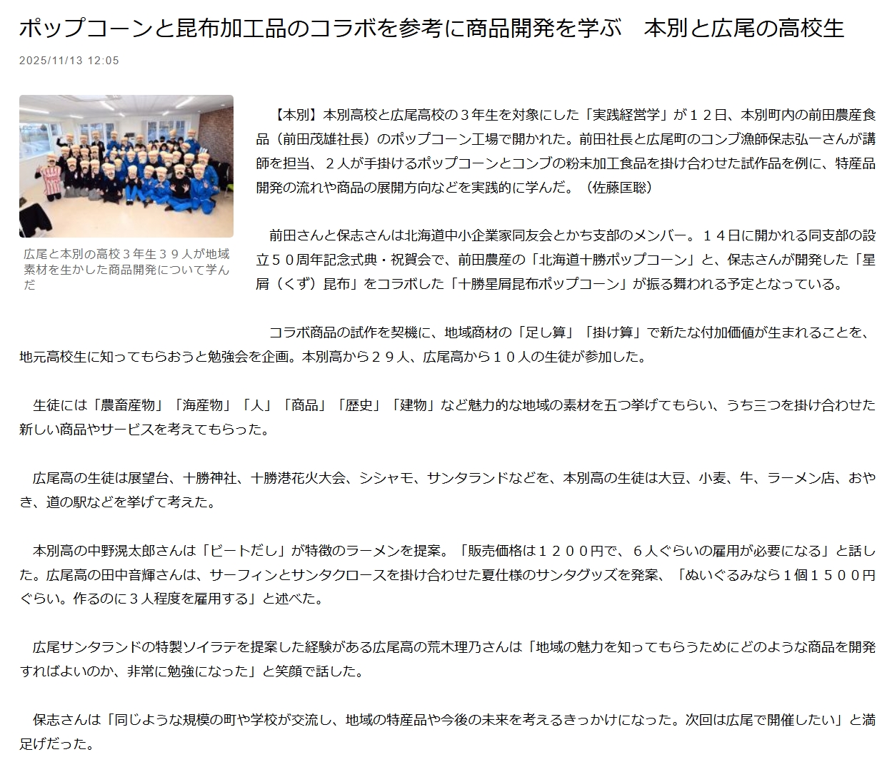 十勝毎日新聞11月13日 ポップコーンと昆布加工品のコラボを参考に商品開発を学ぶ 本別と広尾の高校生 11.13.jpeg