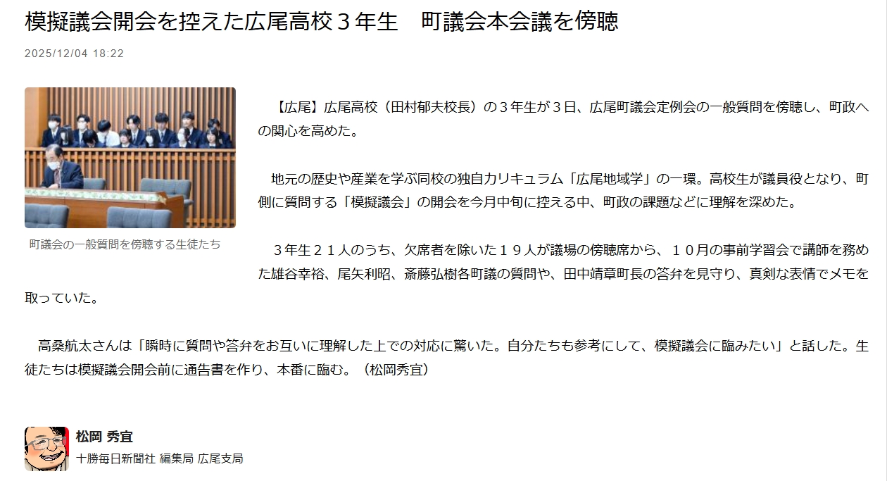 十勝毎日新聞12月 4日 模擬議会開会を控えた広尾高校3年生、町議会本会議を傍聴.jpeg